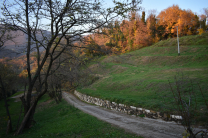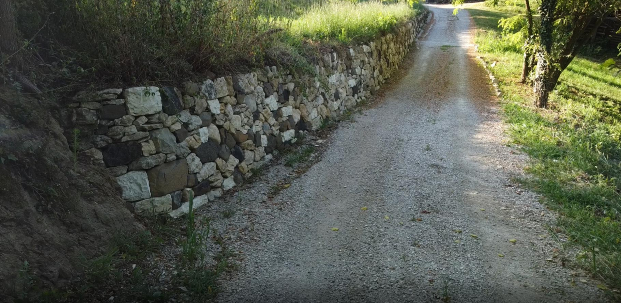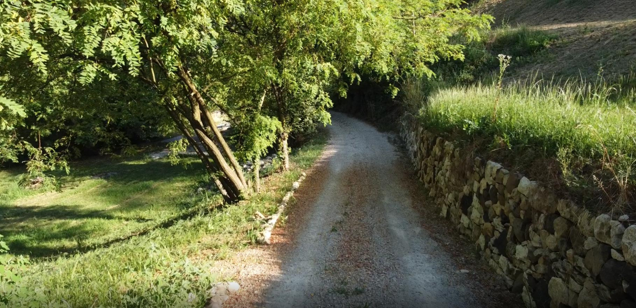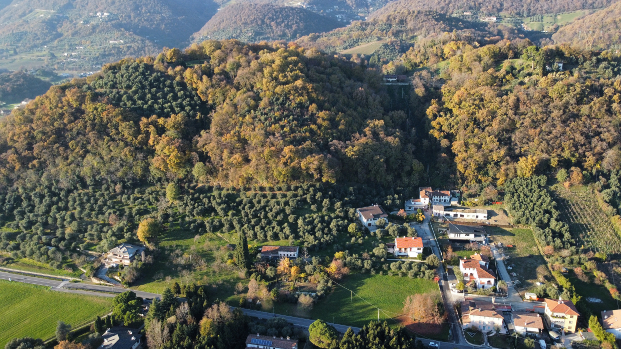 Il percorso è creato da un fondo agricolo situato nella prima area collinare di Bassano del Grappa in direzione zona Delle Acque verso la Strada Comunale di Rivon, oggi via Pascolara. Qui tra le altre sorgono la chiesa di S. Giorgio e altri importantissimi insediamenti del periodo Longobardo su preesistenze Romane e Paleovenete.Costituito ante 1835 e facente parte della originaria proprietà Michiel di villa Angarano il fondo si estende su 6.4 h di terreno e dalla data di acquisizione resta invariato fino ad oggi. Al centro di codesto fondo, nella sella tra le due zone collinari, vi sono edificati due fabbricati rurali, qui si sviluppano alcune culture specializzate in rapporto con la struttura del territorio. Dal punto di vista naturalistico la zona è conosciuta per le sue risorgive acquose, l’area comprende anche la limitrofa Oasi Gemma, ex cava di basalto di proprietà dell’Amministrazione Comunale di Bassano del Grappa. La caratteristica geologica e morfologica del terreno è fondamentalmente vulcanica e pertanto l’abbondanza di basalto e pietre calcaree ha reso possibili le costruzioni degli edifici con i materiali locali, si noti infatti che il fabbricato è stato eretto direttamente e quasi esclusivamente con le pietre del posto. La presenza dei numerosi muri a secco constata che l’intero territorio, anche fuori dalla zona di estrazione della cava è delle stesse. I numerosi muri a secco che si trovano disseminati nella proprietà, sono principalmente lungo i confini dove sarà possibile costituire un sentiero circolare, ma soprattutto in prossimità delle zone dell’uliveto mentre dove una volta era piantato il vigneto troviamo terrazzamenti che oggi sono completamente precipitati. Un progetto specifico che contrasta l’abbandono delle aree agricole terrazzate, di cui la Regione Veneto è partner capofila dell’iniziativa nella Comunità Europea, ha già individuato nel Canale del Brenta la ricchezza e la varietà dei manufatti presenti sul territorio, pertanto l’importanza della valorizzazione del patrimonio architettonico e paesaggistico rurale in questa area emerge con grande unicità e ripristinare l’identità originale del fondo e le sue culture, a partire dalla ricostruzione della struttura muraria a secco e dei terrazzamenti, è di grande valore.